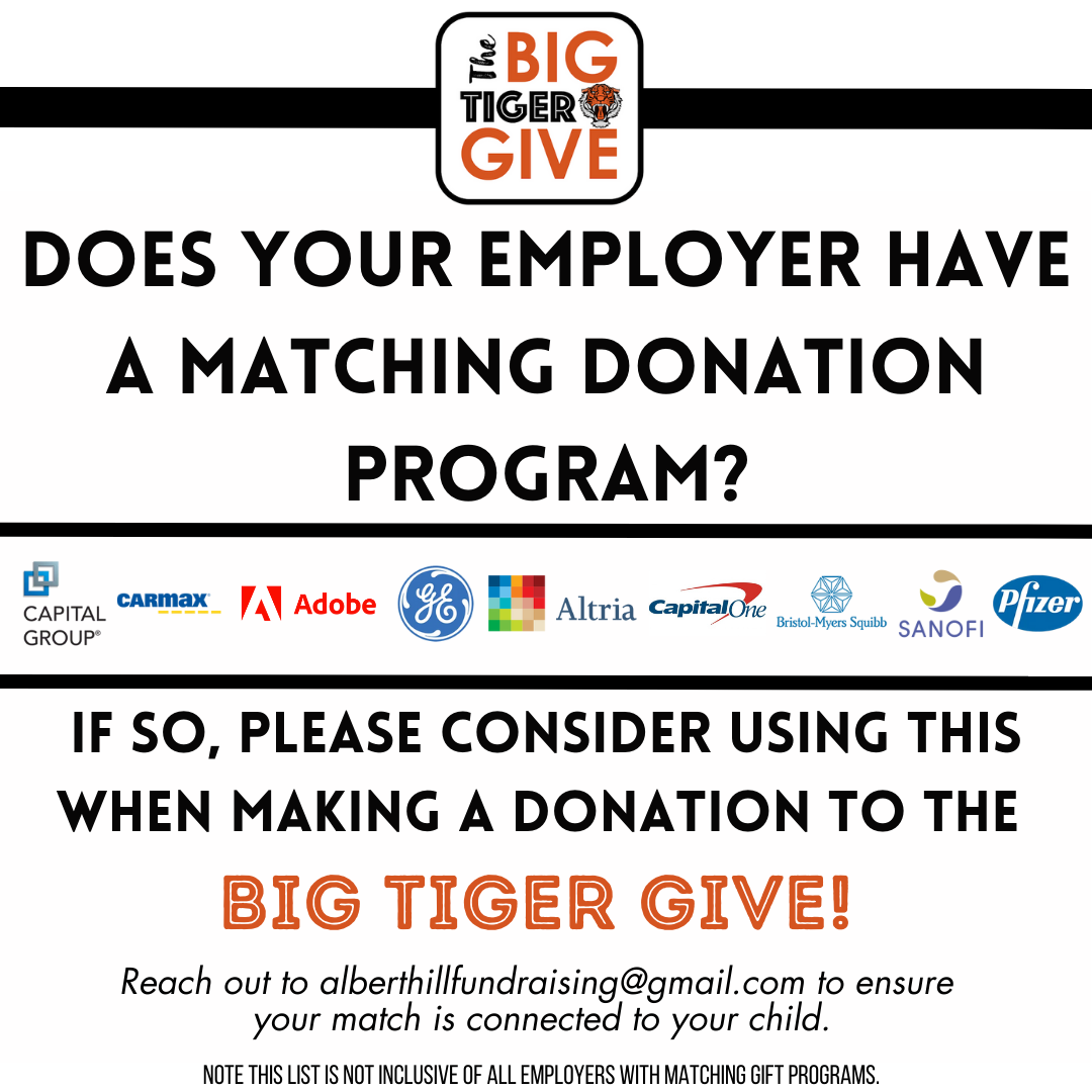 Many large employers in the Richmond area have corporate match programs, where your donation will be matched by a donation from the employer. These matches are really helpful when donating to the Big Tiger Give as it can significantly increase your donation. Around Giving Tuesday (December 3rd this year), some corporations will even double their match, tripling your donation. If your company has a matching donation program and you need our help navigating the system (often administered through Benevity), please reach out to alberthillfundraising@gmail.com. We’re happy to help work through it with you or your program administrator and we’re incredibly grateful for your help in increasing our funds raised.